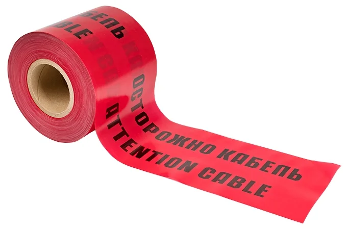 Лента сигнальная красная ЛСЭ 150 (красно/черная) с нанесенным логотипом черного цвета «Осторожно кабель. Attention cable» предназначается для идентификации электрических кабелей. Применение такой сигнальной ленты обеспечивает экономию на материалах, используемых для защиты силового кабеля.