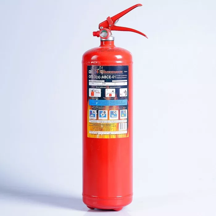 Переносной порошковый огнетушитель ОП-3 для тушения твердых веществ, жидкостей и газов, а также электроустановок под напряжением.